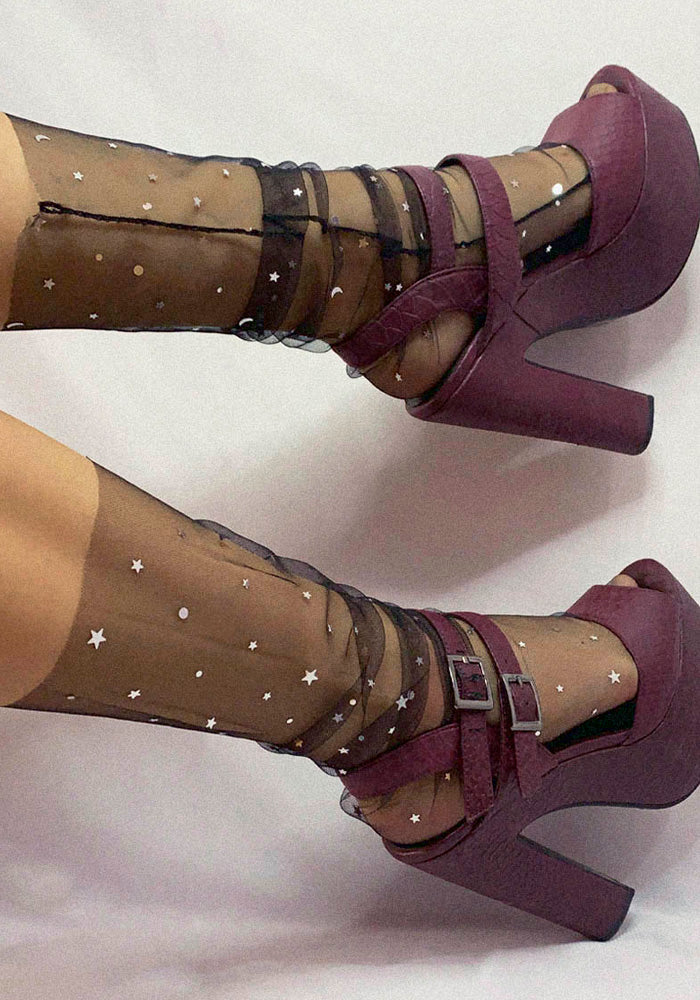 Las primeras calcetas que tuvimos en PIMENTA. En un tul color negro, decoradas con estrellas y lunas. Material semi stretch. Altura abajo de pantorrilla.