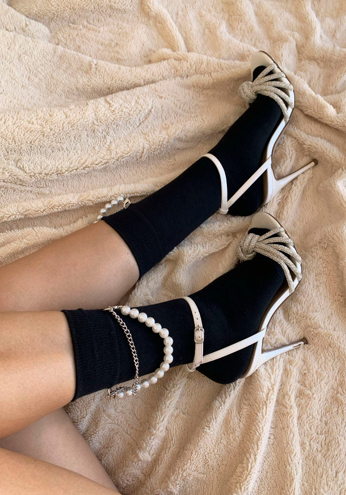 Una vibe punk, que no sabías que necesitabas. Calcetas negras súper stretch con cadenita decorativa y perlas. Porque puedes ser punk, pero el GLAM, nunca se te quitará.