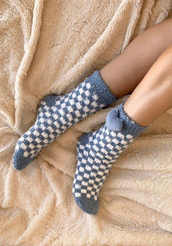 Calcetas afelpadas en altura abajo de pantorrilla. Con diseño de cuadricula en color azul grisáceo. Decoradas en costado con corazón esponjoso.