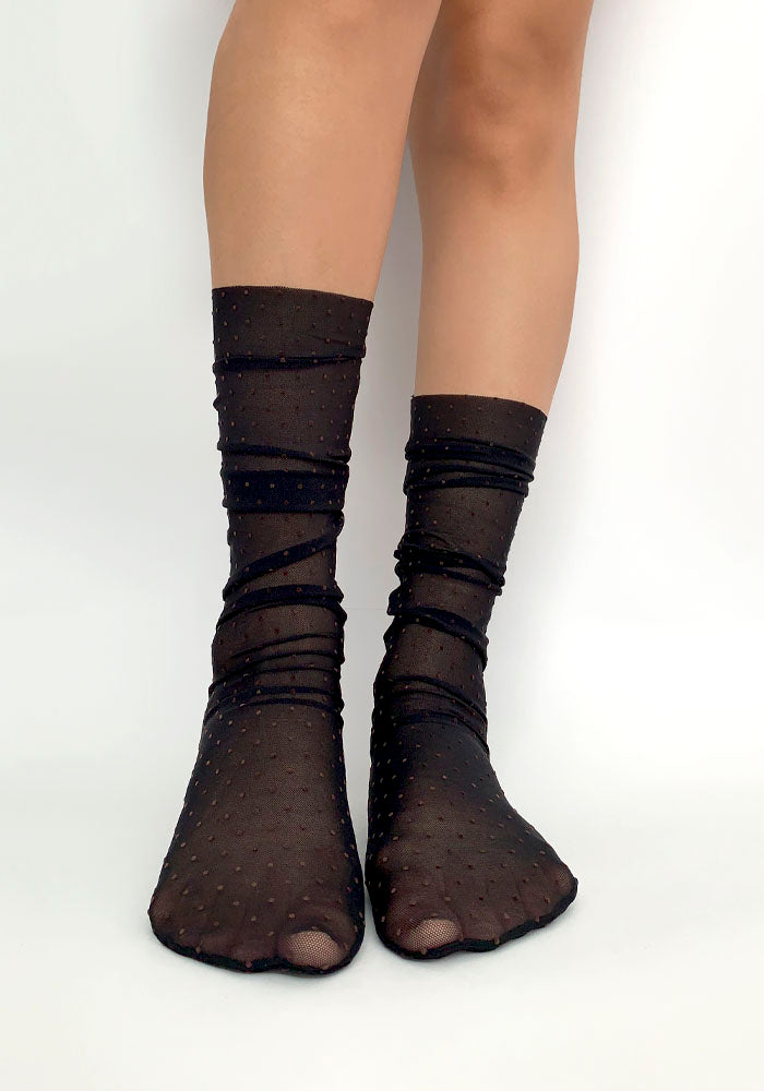 Calcetas en mesh stretch color negro. Tejido tipo red con diseño de mini puntos color cafés en terciopelo. Las necesitas. No hay más descripción. Tus looks te lo van a agradecer.
