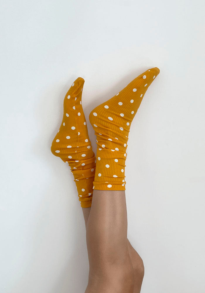 Calcetas en lycra de algodón. Súper suavecitas, súper stretch. Estampado puntos blancos, con fondo mostaza miel.