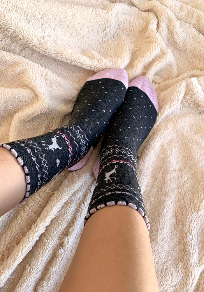Calcetas en tejido color gris obscurso. Material suave. Decorados con animales invernales y diseño de zig zag, muy invernal de nuestra parte... pero vaya, ¡que viva el frío!