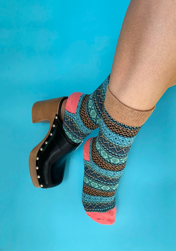 Calcetas en altura abajo de pantorrilla en esta textura gruesa y con tejido clásico invernal. Muy "ski vibes". En color turquesa y coral. Para un verdadero look EXTRA.