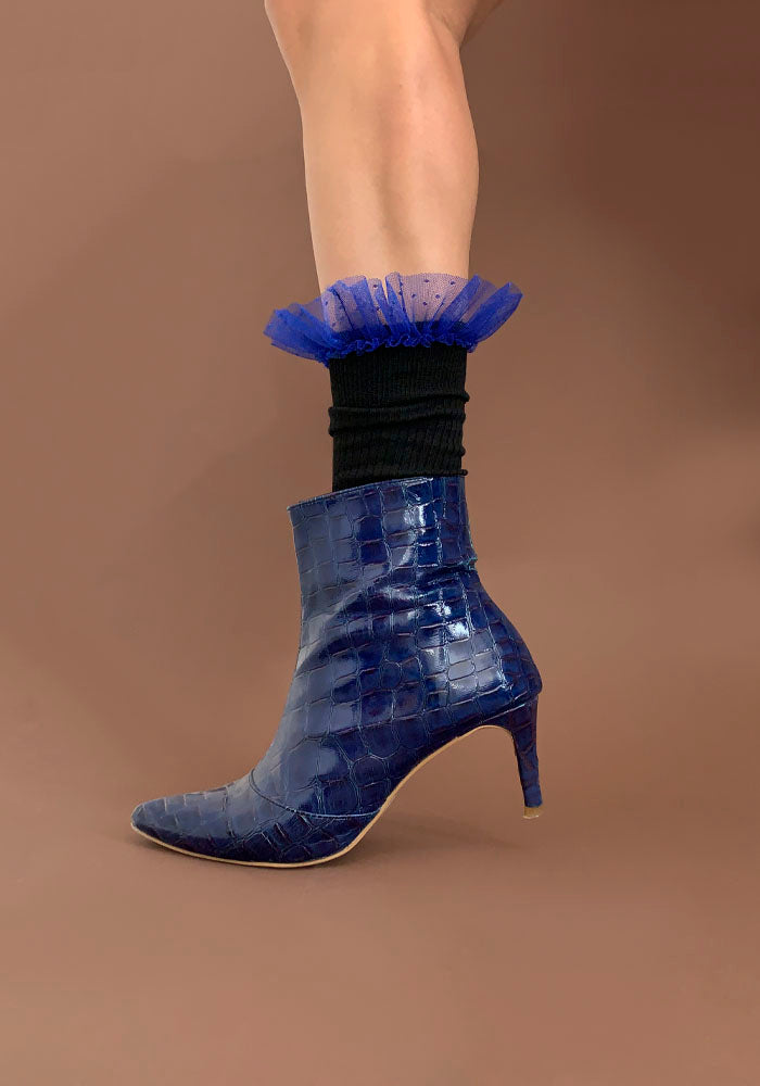 Calcetas en altura abajo de pantorrilla. Color negro. En un tejido suave y lindo. Decoradas con un vuelo de tul en color azul rey, en la parte superior.